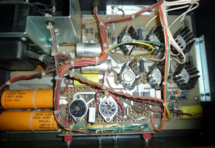 This had the 47k 5W resistor replaced with a 100ohm one, which had blown the 7 Zeners 27V, replaced them but the HT was stuck at around 200 V. I put the valves on my tester (Knight 400) which gave them the okay, 2x 6L6 and a 12AT7 (ECC81). I found one of the 100 ohm grid resistors o\c and replaced the TL071 all to no avail. The regulator seemed to be acting strange, pointing to faulty valves. As I didn't have any spares I had to leave it un-repaired!
