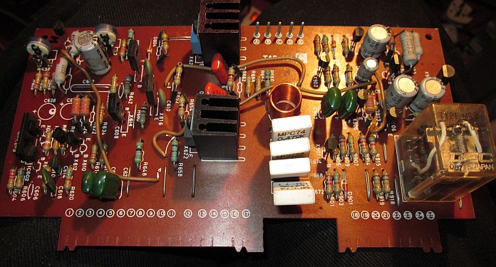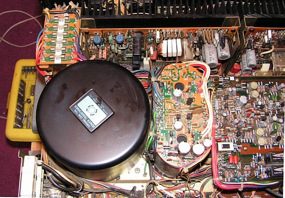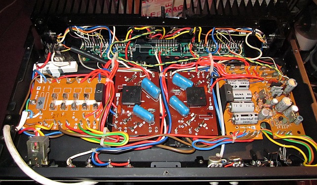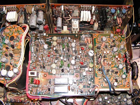 The graphic display wasn't working, one channel wasn’t working in stereo mode and the inputs were on all the time. Resistor 10 ohm had blown to the regulator, two capacitors were shot 2.2µF 50 V on the power amp and the input IC TC9164 needed replacing.