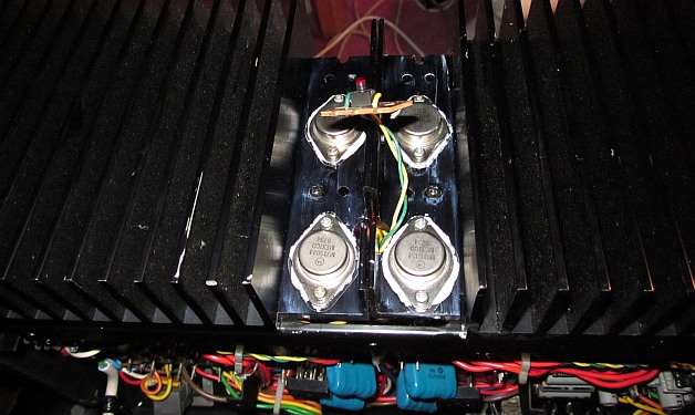 This one worked but checking the o\p DC voltages - they were all over the place. The now normally faulty transistors Hitachi '2SC1345' were the culprits. Two in the differential input stage of each amp, setting the quiescent and o\p 0 V was easy after this. A very well made amp manages 90 W a channel in 2 ch mode 40W/ch in 4 ch mode and weighs a ton!