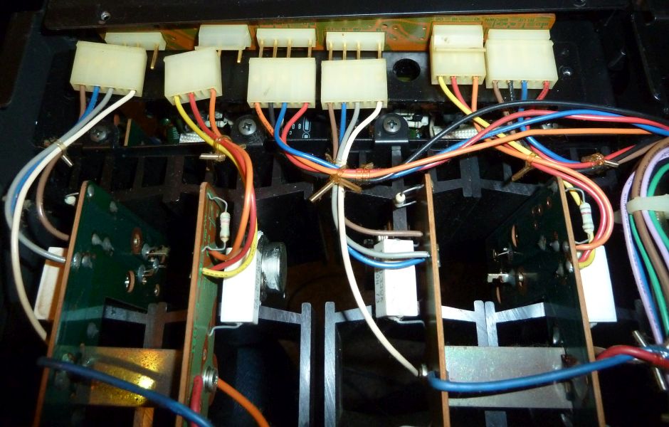 There are fusible resistors used in the power amp section and the preamp section that are going faulty, ie high resistance for no reason, they are 150 ohm in the power amp and 82ohm in the pre amp, the sound becomes distorted and weak when they are the wrong value. There are 2 sets of the 82ohm resistors, one is on the RH vertical board and the others are under the front cover behind the switches. I would recommend replacing the capacitors on the PSU board also 100 µF 63V and 220 µF 63V, and remove the glue holding them in place as over time it begins to corrode the components.