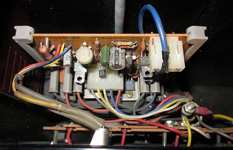 After using the amplifier for a while through the line inputs I noticed something was not right. The sound was blurred, checking the left channel quiescent found it at 0.6 Amps. Further checks showed the transistors were okay, however, turned out to be the amp was oscillating at some MHz. I found the capacitors (the square black ones that gave problems in the AU-919) had lost their capacitance, mainly the 10pF ones.