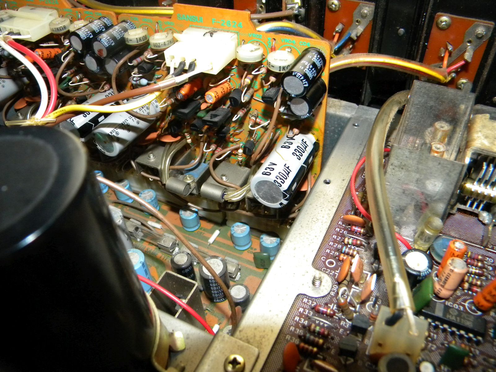 Vintage integrated amplifier from Sansui dating from around 1965. There was no HT (High Tension) to the driver valves, there was a short under the large resistors that drop the voltage for the different HT sections.